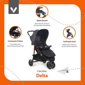 O Travel System Delta TS DUO PRO da Voyage é um conjunto composto pelo carrinho Delta e bebê conforto Beta. O carrinho tem três rodas, moderno, com barra frontal removível e um confortável colchonete acolchoado, também removível e lavável. Possui cinto de segurança de 5 pontos, com altura e largura reguláveis. A inclinação do encosto pode ser ajustada em múltiplas posições desde a mais deitada até sentada: perfeito para os recém-nascidos, que também contam com a elevação do apoio de pés, para maior conforto, e perfeito para os maiorzinhos passearem observando tudo (com o apoio de pés abaixado).