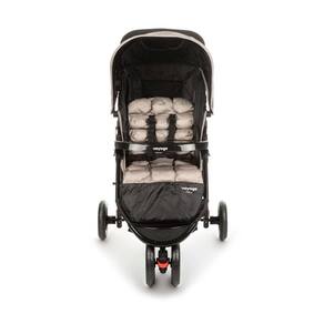Para os pais, tem manopla com revestimento macio, capota retrátil com visor, amplo cesto porta-objetos com capacidade para 5 kg e bolso na capota. Trava de giro na roda dianteira e freio interligado, de fácil acionamento, nas traseiras.