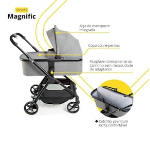 Rígido e com alça integrada para transporte: pode ser carregado com o bebê dentro. Acompanha cobre-pernas para proteção de vento e frio. Acompanha colchão premium. Encaixe diretamente ao carrinho sem necessidade de adaptador. É dobrável e tem janela de ventilação com zíper na parte traseira.Fácil de higienizar: a capa do colchonete e o revestimento interno são removíveis para lavar