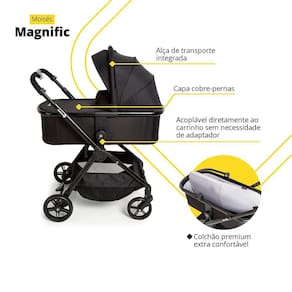 Rígido e com alça integrada para transporte: pode ser carregado com o bebê dentro. Acompanha cobre-pernas para proteção de vento e frio. Acompanha colchão premium. Encaixe diretamente ao carrinho sem necessidade de adaptador. É dobrável e tem janela de ventilação com zíper na parte traseira.Fácil de higienizar: a capa do colchonete e o revestimento interno são removíveis para lavar