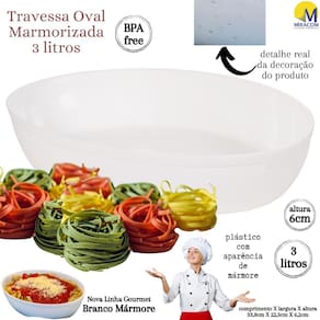 Este produto da nova linha marmorizada traz um toque peculiar, estiloso e moderno aos seus utensílios de servir. A travessa conta com um espaço generoso para servir saladas, churrasco, massas, enfim, refeições volumosas. O produto é fabricado em polipropileno atóxico de alta densidade, totalmente seguro para a alimentação e livre de BPA em sua composição. A decoração no fundo do produto é permanente devido à tecnologia intraimagem aplicada em sua fabricação, que não permite desbotamento e mantém os detalhes marmorizados vivos por mais tempo. A travessa, inclusive, pode ser levada com segurança tanto ao freezer como microondas, sem comprometimento da integridade do material e tampouco da saúde de quem nele se serve. O produto suporta temperaturas extremas variantes entre -10º e 120º, embora não possa ser levado ao forno convencional.