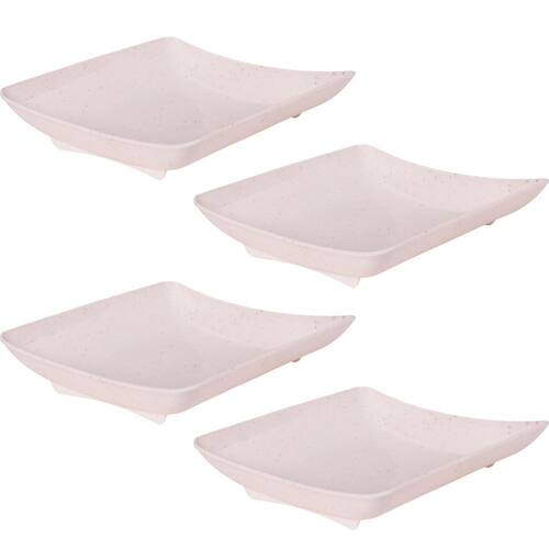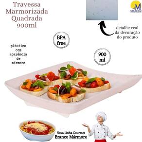 Travessa rasa quadrada de plástico com pés para servir porções, petiscos e antepastos, com decoração predominantemente branca com leves traços/ranhuras pretas por toda a peça, que traz uma aparência marmorizada super requintada à travessa.