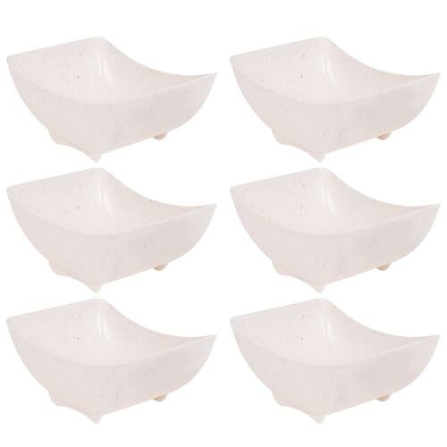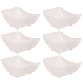 Travessa funda retangular de plástico com pés para servir porções, petiscos e antepastos, com decoração predominantemente branca com leves traços/ranhuras pretas por toda a peça, que traz uma aparência marmorizada super requintada à travessa.