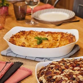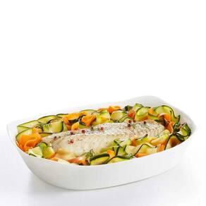 A travessa é segura para uso em forno, micro-ondas em uma temperatura de até 250°.
