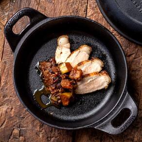 Travessa Estilo Redonda Ferro Tampa Vidro PanelaMineira 14cm A Travessa Estilo Redonda Alça de Ferro da Panela Mineira é um produto moderno, prático e eficiente, que apresenta alto desempenho no preparo de diversas receitas. O calor distribuído por toda a superfície faz com que o alimento cozinhe de maneira uniforme, conservando suas propriedades e nutrientes. Além de tudo, possui um design autêntico e elegante, com fundo reto preto e alças largas, o que a torna excelente para assar, grelhar, fritar, cozinhar e servir. Muito utilizada em bares e restaurantes para porções menores. Onde usar: Devido a sua versatilidade, pode ser utilizado em fogões a gás, a lenha, elétricos, cooktops de indução, vitro-cerâmicos, fornos, grills, churrasqueiras e fogo de chão. Não aconselhamos a usar a tampa no forno, devido ao batoque ter partes em polipropileno. Orientação de Uso e Conservação:Antes do primeiro uso: Lave com água e sabão, seque bem com um pano e leve ao fogo para remover toda a umidade. Já vem pronta para uso, então não precisa ser curada. Guarde em um local seco. Após cada uso: Lave com água e sabão, usando uma esponja ou escova para remover todos os resíduos de alimentos. Se restarem resíduos, ferva água com um pouco de detergente para soltá-los. Pintura: Revestimento atóxico que garante durabilidade e proteção prolongada, sem causar nenhum dano à saúde. Características Técnicas e Medidas: Linha: Bares e Restaurantes.Altura Sem Tampa: 3,5cm.Altura Com Tampa: 8cm.Material: Ferro Fundido.Modelo: Redonda.Diâmetro: 14cm.Litragem: 0,4L.Peso: 0,86Kg.Alças: Ferro.Chapa: Lisa. Itens Inclusos: 01 Travessa Estilo Redonda Alça Ferro Panela Mineira 14cm 0,4L.01 Tampa de Vidro Temperado 14cm.01 Batoque em Platinela. Código: 5027PMProdutoLojaPlast.