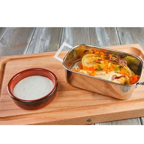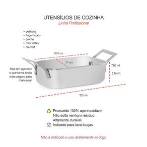 Contem: 1 Mini Travessa Capacidade: 780 ml Medidas: 22 x 11 x 5,6 cm Material: Aço Inoxidavel Peso: 170 gramas Obs: Não é indicado o uso diretamente ao fogo.