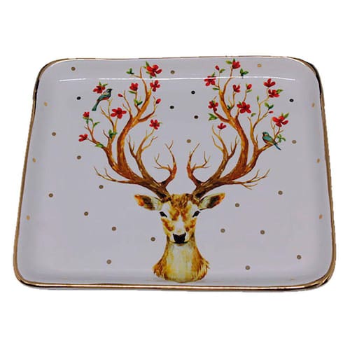 01 Travessa Retangular Cerâmica Méd. Rena Deer Borda Ouro 15,5 x 18 x 2cm