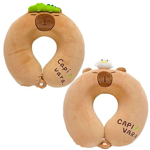 - Travesseiro de viagem com rosto de uma capivara bordado e um pássaro de pelúcia na cabeça