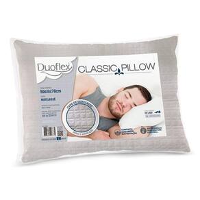 Travesseiro Duoflex Espuma Classic Pillow 50X70X18 A Duoflex também disponibiliza ao mercado, os travesseiros de espuma de poliuretano expandida, também conhecida como espuma fria. A linha de travesseiros de espuma fria oferece uma diversidade de modelos que atendem aos mais variados gostos e necessidades durante o sono. São travesseiros colados, flocados e/ou anatômicos, extremamente confortáveis e produzidos com total proteção antiácaros, fungos e bactérias. Alguns modelos possuem também gomos massageadores que estimulam a circulação. Toque e maciez superiores aos da espuma comum. Maior frescor e ventilação. Antiácaro. Medidas: 50X70X18Cm Capa Matelassê - 100% Poliester. Espuma Poliuretano