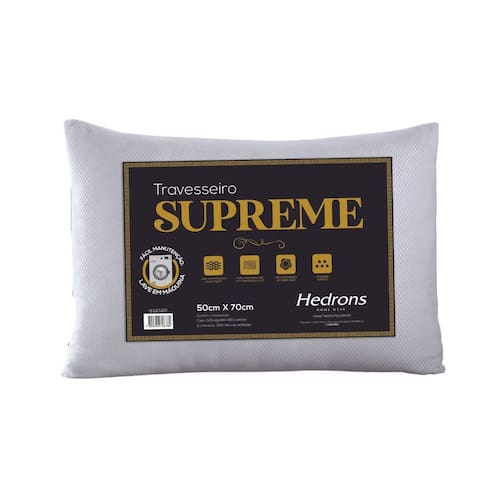 DescriçãoTravesseiro Hedrons SupremeO Travesseiro SUPREME Hedrons é um excelente travesseiro que contém composição especial de fibras, para proporcionar um travesseiro de suporte firme, ideal para quem dorme de lado.Um travesseiro de qualidade superior, com fibras extra macias e capa em tecido diferenciado, com trama mais fechada no clássico PIQUET de visual nobre.Não Alérgico, Fácil manutenção, pode ser lavado na máquina. CONTEÚDO DA EMBALAGEM:- 01 Unidade de Travesseiro SUPREME Hedrons Têxtil- Medida: 50x70 cm ESPECIFICAÇÕES TÉCNICAS:- Material: Enchimento 100% Poliéster- Marca: Hedrons Têxtil- Linha: SUPREME COMPOSIÇÃO:Capa: Tecido em delicados relevos de inspiração piquet em 100% poliésterTecido: (56% algodão e 44% poliéster) e enchimento (100% fibra de poliéster)Cor: Branco