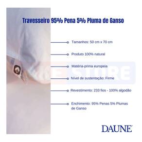 Ficha Técnica: - Cor: Branco - Composição do enchimento: 95% Penas e 5% Plumas - Material da capa: : Inlett 233 fios - 100% algodão de alta qualidade - Produto 100% natural - Matéria-prima europeia - Nível de sustentação: Firme - Dimensões: 50 x 70 cm - Cuidados: Lavagem à seco recomendada. Não lavar à máquina.