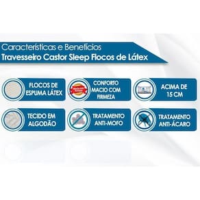 Imagens Meramente Ilustrativas. Não nos responsabilizamos pela montagem/instalação dos produtos. Todas as informações divulgadas são de responsabilidade exclusiva do fabricante/fornecedor. Tecido com Tratamento: AntiÁcaro e AntiFungo | Tipo de enchimento: Látex | Tipo de Conforto: Macio c/ Firmeza | Certificações de Qualidade: Tecnologia Americana | Tempo de Garantia: 3 meses | Altura do travesseiro: Alto | Nossa Avaliação: Qualidade Excelente | Tecido da Capa de Revestimento: Algodão | Vantagens Extras do Travesseiro: Lavável | Quantidade por Embalagem: 1 unidade | Formato do Travesseiro: Tradicional | Formato de Venda: Unidade | Garantia de Fábrica: Garantia de Fábrica | É hipoalergênica: Sim | É antiácaros: Sim | É Antibacteriana: Sim | Com aromaterapia: Não | É kit: Não | É Lavável: Sim | Com Zíper: Não | Com fronha removível: Não | Com memoria: Não | Unidades por kit: 0 | É inteligente: Não | É antihongos: Sim | Fonte do produto: N/A | Condição do item: Novo | Produto: N/A | Código universal de produto (GTIN): 7895606947995 | Condição do Item: Novo | Link Site: https://www.costaricacolchoes.com.br/produtos.asp?produto=237 | Numeral: 0 | Não se Aplica: N/A | Não Possui: Não | Link Youtube: https://www.youtube.com/watch?v=0LcSiaveiAE | ID Youtube: 0LcSiaveiAE | Linha/Modelo: Castor | Cor Cnova: Blush | Cor Meli: Ciano | Contatos Sac Fábrica: sacmg@castor.ind.br/sac3@castor.ind.br | Categoria Trilha: Cama, Mesa e Banho> Travesseiro Látex | Categoria - Sub: Travesseiro Látex | Categoria - Pai: Cama, Mesa e Banho | Comprimento Embalagem: 65.00 | Largura Embalagem: 45.00 | Altura Embalagem: 16.00 | Peso: 2.88 Kg | Kit: 0 | Peso Real Kg: 2.88 | Peso Cubado: 12.50 | Volumes: 1 | M3: 0.05 | Comprimento/Profundidade: 65 cm | Largura: 45 cm | Altura: 16 cm | Tamanho Montado: Larg:45.00 x Comp/Prof:65.00 x Alt: 16.00 | Comprimento/Profundidade Montado: 65.00 | Largura Montado: 45.00 | Altura Montado: 16.00 | Data Cadastro: 2023-7-2 2:25:33 | Sigla Estoque: 6 | Marca: Castor Ean: 7895606947995