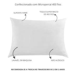 Composição: Tecido: 100% poliéster - micro percal 400 fios Enchimento: 100% poliéster Possível lavar e secar em máquina Cuide da sua saúde e do seu bem-estar trocando seu travesseiro a cada 2 anos. Para maior durabilidade, afofe seu travesseiro diariamente. Atenção: foto ilustrativa