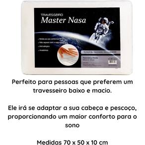 Desfrute de pausas agradáveis com o seu Master Comfort Master Nasa. Seu desenho efetivo garantirá um sono repousante e confortável.Experiência práticaPor sua vez, é facilmente lavável, dando-lhe a capacidade de remover a sujeira quantas vezes quiser e evitar o acúmulo de poeira.Proteção e cuidadosGraças ao seu material hipoalergênico, você poderá dormir tranquilo e evitar alergias ou complicações de saúde. Este produto lhe dará ótima qualidade no seu relaxamento diário.