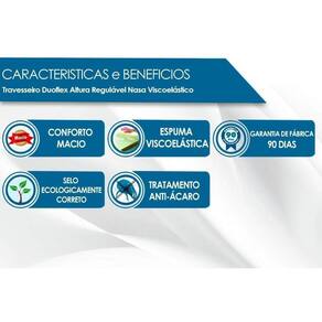 BENEFÍCIOS EXTERNOS DO ACESSÓRIO DE CAMA E COLCHÃO Tipo de Conforto - Macio Quantidade de fios - 200 Tecido com Tratamento - AntiÁcaro e AntiFungo Altura do travesseiro - Regulável Tecido da Capa de Revestimento - Algodão