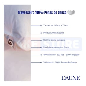 Ficha Técnica: - Cor: Branco - Composição do enchimento: 100% Penas - Material da capa: : Inlett 233 fios - 100% algodão de alta qualidade - Produto 100% natural - Matéria-prima europeia - Nível de sustentação: Firme - Dimensões: 50 x 70 cm - Cuidados: Lavagem à seco recomendada. Não lavar à máquina.