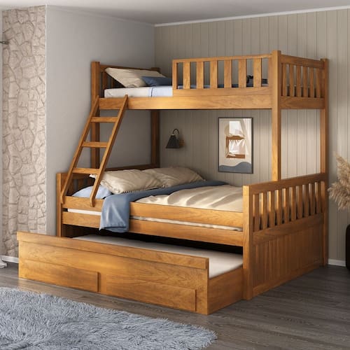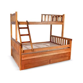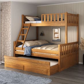 Características: Estrutura de Madeira Maciça Estrado de Madeira Acabamento em verniz fosco Cama auxiliar possui rodízios: Sim Rodízios fixo: Sim parafusados Rodízios de silicone ou plástico: zinco amarelo Tamanho do colchão indicado para cada cama: Cama de cima 88X188, cama auxiliar 88x188 e cama do meio 1,38x1,88 Indicação da altura do colchão da cama auxiliar: até 18cm Peso suportado:150kg cada cama Não acompanha colchão