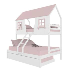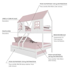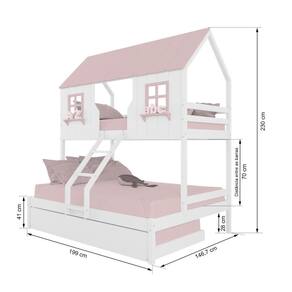 Material Principal: Madeira Maciça | Cor Predominante: Branco/ Rosa | Necessita Montagem: Sim | Acompanha Colchão: Não | Tipo de Cama: Beliche Casal/ Solteiro | Altura: 230 | Largura: 146,7 | Comprimento: 199 | Peso: 103 | Peso máximo suportado: 120 e 220 | Cor Via: Branco | Peso com Embalagem: 103 | Comprimento com Embalagem: 192 | Largura com Embalagem: 30 | Altura com Embalagem: 30 | Tamanho da Cama: Beliche Casal/ Solteiro | Descrição do Tamanho: Beliche Casal/ Solteiro | Quantidade de Caixas: 05