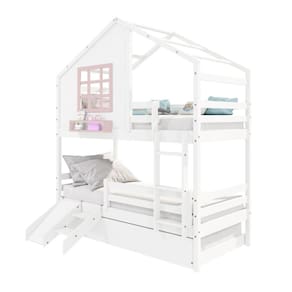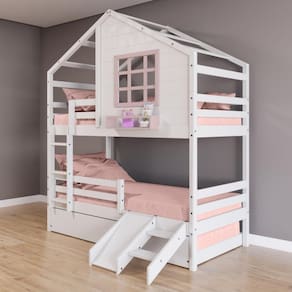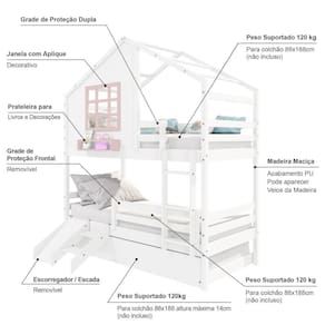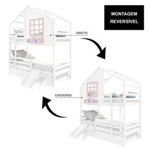 Diferenciais: Escada Fixa, Auxiliar com 4 Rodízios, Kit Escada/ Escorregador, Grade de Proteção Removível, Casinha com fechamento em MDF, Janela e Prateleira para Livros e Decoração, Montagem Reversível (Lado Direito ou Lado Esquerdo)
