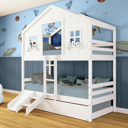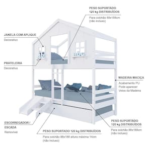 Diferenciais: Escada Fixa, Auxiliar com Rodízios, Casinha com fechamento em MDF, Janela e Prateleira Decorativa, Kit escada/ escorregador.