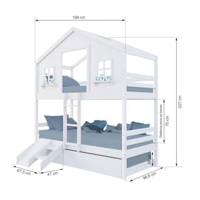 Material Principal: Madeira Maciça | Cor Predominante: Branco | Necessita Montagem: Sim | Acompanha Colchão: Não | Tipo de Cama: Beliche | Altura: 227 | Largura: 96,6 | Comprimento: 199 | Peso: 91 | Peso máximo suportado: 120 | Cor Via: Branco | Peso com Embalagem: 91 | Comprimento com Embalagem: 192 | Largura com Embalagem: 30 | Altura com Embalagem: 30 | Tamanho da Cama: Beliche Solteiro | Descrição do Tamanho: Beliche Solteiro | Quantidade de Caixas: 06
