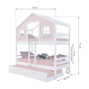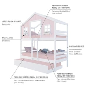 Material Principal: Madeira Maciça | Cor Predominante: Rosa/ Branco | Necessita Montagem: Sim | Acompanha Colchão: Não | Tipo de Cama: Beliche | Altura: 227 | Largura: 96,6 | Comprimento: 199 | Peso: 85 | Peso máximo suportado: 120 | Cor Via: Rosa/ Branco | Peso com Embalagem: 85 | Comprimento com Embalagem: 192 | Largura com Embalagem: 30 | Altura com Embalagem: 30 | Tamanho da Cama: Beliche Solteiro | Descrição do Tamanho: Beliche Solteiro | Quantidade de Caixas: 05