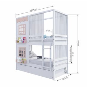 Diferenciais: Escada Fixa, Auxiliar com 4 Rodízios, Kit Cortina Superior e Inferior, Casinha com fechamento em MDF, 02 Janelas e Prateleira para Livros e Decoração, Montagem Reversível (Lado Direito ou Lado Esquerdo)