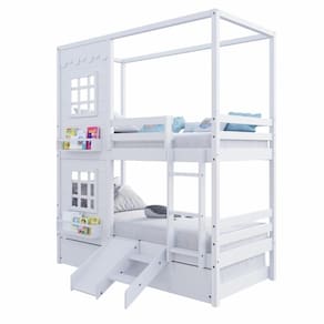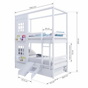 Diferenciais: Escada Fixa, Auxiliar com 4 Rodízios, Kit Escada/ Escorregador, Casinha com fechamento em MDF, 02 Janelas e Prateleira para Livros e Decoração, Montagem Reversível (Lado Direito ou Lado Esquerdo)