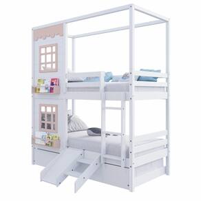 Diferenciais: Escada Fixa, Auxiliar com 4 Rodízios, Kit Escada/ Escorregador, Casinha com fechamento em MDF, 02 Janelas e Prateleira para Livros e Decoração, Montagem Reversível (Lado Direito ou Lado Esquerdo)