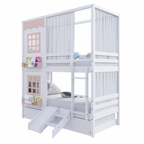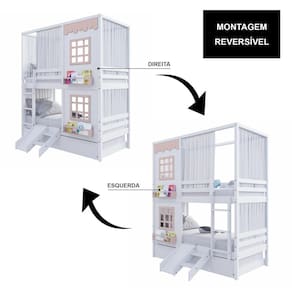 Diferenciais: Escada Fixa, Auxiliar com 4 Rodízios, Kit Escada/ Escorregador, Kit Cortina Superior e Inferior, Casinha com fechamento em MDF, 02 Janelas e Prateleira para Livros e Decoração, Montagem Reversível (Lado Direito ou Lado Esquerdo)