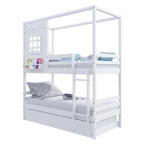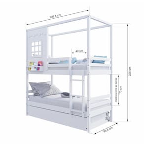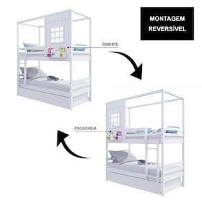 Diferenciais: Escada Fixa, Auxiliar com 4 Rodízios, Casinha com fechamento em MDF, Janela e Prateleira para Livros e Decoração, Montagem Reversível (Lado Direito ou Lado Esquerdo)