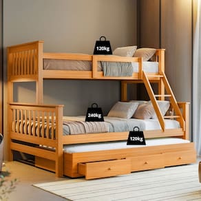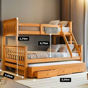 Detalhes do Produto: Modelo: WBL105O01030 Material: Madeira maciça de pinus de reflorestamento + MDF 2,2 cm Acabamento: Laca semi-brilho (30%) Gavetas: Altura: 17 cm | Largura: 60 cm | Profundidade: 53,5 cm Peso Suportado: Cama de casal: até 240 kg Cama de solteiro: até 120 kg Cama auxiliar: até 120 kg Altura entre camas: 70 cm Acessórios inclusos: Escada fixa + Cama auxiliar com rodízios Colchões (não inclusos): Casal: 188x138x18 cm Solteiro: 188x88x20 cm Auxiliar: 188x88x15 cm Dimensões: Treliche (CxAxL): 204 x 170 x 151 cm Cama auxiliar (CxAxL): 192 x 30 x 96 cm Cores disponíveis: Castanho Branco Amarelo Ouro (As tonalidades podem variar conforme as configurações do seu dispositivo) Itens Inclusos: 1 Treliche (beliche casal/solteiro + cama auxiliar com gavetas) Kit ferragens Manual de montagem Necessita montagem (serviço não incluso). Imagens meramente ilustrativas. Garantia de 3 meses contra defeitos de fabricação.