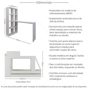 Especificações Técnicas: Treliche - Altura: 165cm | Largura: 229,5cm | Profundidade: 87cm Colchões - Altura: 12cm | Largura: 188cm | Profundidade: 78cm Escrivaninha com Estante - Altura: 149,5cm (estante) - 75,5cm (mesa) | Largura: 135cm | Profundidade: 64,5cm (estante) - 30cm (mesa) Material: MDP (lastro em madeira) Acabamento: Acetinado Tipo de Cama: Treliche Tipo de Escada: Metálica em ângulo Acompanha Escrivaninha: Sim Colchões Inclusos: Sim Densidade dos Colchões: D23