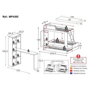 Conteúdo da Embalagem: 1 (um) Treliche 3 (três) Colchões 1 (uma) Escrivaninha com Estante Manual de Montagem Kit Ferragem