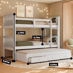 Modelo: WBL104O01030 Material: Madeira Maciça de Pinus de Reflorestamento e mdf de 2,2cm de espessura. Pintura/Acabamento: Pu Branco/Castanho e UV 30% brilho (deixando aparente os veios da madeira) Medidas das Gavetas: A: 17 cm - L: 60 cm - P: 53,5 cm Para Colchões de Dimensões (cm x cm): 188x88 - Colchão da Cama Auxiliar Máximo 15 cm altura. Colchão: Não incluso Peso Suportado : 120 Kg por cama Acessórios: Escada Fixa e Cama Auxiliar (com rodízios) (com gavetas). Altura entre camas: 70cm