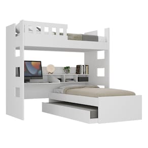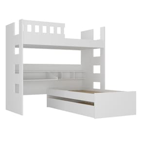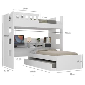 A Treliche com Escrivaninha Foscarini é uma excelente alternativa para espaços reduzidos, proporcionando a otimização do espaço sem abrir mão da estrutura segura e confortável. Ótima opção para quem busca ambientes jovens, únicos, descontraídos e modernos, oferecendo um espaço para criar e sonhar. Pensando no conforto e segurança, a cama superior possui grade de proteção lateral e um fácil acesso através da escada. É produzida 100% em MDF, confeccionada com materiais de alta qualidade, apresenta estrutura resistente e durável, capaz de suportar até 100 kg. Montagem Flexível para ambos os lados. Indicada para colchões de 88 x 188 cm. Altura Máxima do colchão para Cama Auxiliar 18 cm. Seu sistema de montagem é rápido, fácil e descomplicado. Se encaixa perfeitamente em vários ambientes. Acompanha Cama Auxiliar: Sim Acompanha Colchão: Não Altura do Estrado até o Chão: 135 Ambiente Principal: Quarto Infantil Cama Auxiliar com Rodízio: Sim Cama Auxiliar Suporta Até (kg): 100 codigo_ean: 7908243318575 Complexidade da Montagem: Média: pode ser montado por mais de uma pessoa e/ou necessite de maior conhecimento para montagem Cor: Branco Cor do Produto: Branco Escala de Brilho: Fosco Itens Inclusos: 1 treliche e Manual de Montagem. Linha ou Coleção: Trento Manual de Montagem e Instalação: https://product-hub-prd.madeiramadeira.com.br/878281/documents/30f46593-4a6c-41be-a9c7-1c988eb43b672426u2316819trelicheegrade.pdf Material do Estrado: MDF Material Principal: MDF Necessita Montagem: Sim Origem do Produto: Nacional Permite a Utilização de Cama Auxiliar: Sim Peso: 230 Possui Baú: Não Possui Gavetas: Não Possui Pés: Não Possui Portas: Não Possui Prateleiras: Não Recomendações de Uso, Manutenção e Limpeza: Limpar com flanela ou pano macio seco, não utilizar produtos abrasivos, desengordurantes, álcool ou solvente. Não expor o produto diretamente à luz solar e à umidade. Sistema de Montagem: Parafusos, minifix e cavilhas. Suporta Até (kg): 300 Tamanho do Colchão Indicado (L x C): 88 X 188 Tamanho do Colchão Indicado Cama Auxiliar: 88 x 188 Tipo de Cama: Treliche Tipo de Colchão: Solteiro Tipo de Estrado: Removível Ean: 7908243318575