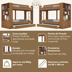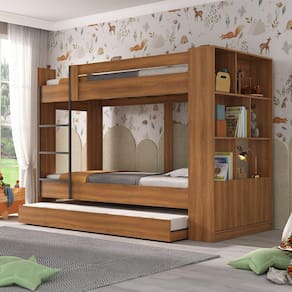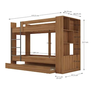 Explore a versatilidade do Treliche Infantil/juvenil Florence 2 Portas com Estante Nogal Espresso, com medidas ideais de 157cm de altura, 215,5cm de largura e 97,5cm de profundidade. Este produto inteligente oferece não apenas um design moderno, mas também praticidade e conforto para o seu dia a dia. Com duas portas, escada metálica e rodízios em polímero, esse treliche é a solução perfeita para otimizar o espaço do seu dormitório. Construído em MDP 15mm com acabamento em Finish Foil fosco, proporciona durabilidade e beleza. Adquira agora e transforme seu quarto com elegância e funcionalidade! Acabamento da Porta: Finish Foil Acabamento dos Pés: Finish Foil Acompanha Cama Auxiliar: Sim Acompanha Colchão: Não Altura do Estrado até o Chão: 121 cm Altura dos Pés: 7 Altura Máxima dos Pés: 7.0000 Ambiente Principal: Quarto Cama Auxiliar Acompanha Colchão: Não Cama Auxiliar com Rodízio: Sim Cama Auxiliar Suporta Até (kg): 80 kg codigo_ean: 7909903493762 Complexidade da Montagem: Alta: deve ser montado por um montador especializado Comprimento: 97.5000 Cor: Nogal Cor do Produto: Nogal Escala de Brilho: Fosco Escala de Brilho da Porta: Fosco Extensível: Não Informações Complementares: Acabamento em Finish Foil. Itens Inclusos: 1 Treliche, Manual de Montagem e Kit Ferragens Manual de Montagem e Instalação: https://product-hub-prd.madeiramadeira.com.br/880667/documents/00038b5a-504f-450f-afcb-69c07990ce249595manualdemontagemcm1226.pdf Material da Porta: MDP Material do Estrado: MDF Material dos Pés: MDP Material Principal: MDP modular: Não Necessita Montagem: Sim Origem do Produto: Nacional Permite a Utilização de Cama Auxiliar: Sim Peso: 100 kg Peso Suportado por cada cama: 80.0000 Possui Baú: Não Possui Gavetas: Não Possui Nichos: 06 Possui Pés: Rodapé Possui Prateleiras: Não Possui Rodízio: Sim Quantidade de Portas: 02 Recomendações de Uso, Manutenção e Limpeza: Utilizar pano úmido Rodízio com Trava: Não Sapatas Niveladoras: Não Sistema de Montagem: Minifix, Parafusos e Cavilhas Suporta Até (kg): 80 kg Tamanho da Cama: Solteiro Tamanho do Colchão Indicado (L x C): 188x88cm Tamanho do Colchão Indicado Cama Auxiliar: 188x88cm Tipo de Cama: Tricama Tipo de Colchão: Solteiro Tipo de Dobradiça/Corrediça da Porta: Metálica Tipo de Estrado: Fixo Tipo de Porta: Bater Tipo de Puxador da Porta: Embutido Ean: 7909903493762