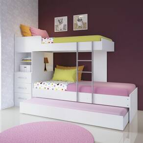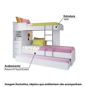 Características - Branco - Estrutura: MDP - Acabamento: Pintura UV /Ecobril - 3 Gavetas - Corrediças Metálicas - Puxadores em ABS - 4 Nichos - Escada em alumínio - Grade de proteção lateral na cama superior - 4 Rodízios - Para colchão 88x188cm (não incluso) - Recomendado o uso de colchão para cama auxiliar com altura de até 12 cm - Peso suportado por cama: 80 kg - Produto entregue desmontado - Marca: Santos Andirá