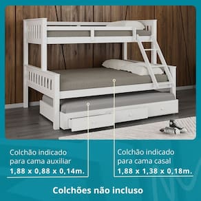 Funcionalidade: Inclui gavetas amplas para armazenamento, uma cama auxiliar com rodízios para maior praticidade e uma escada fixa para fácil acesso às camas superiores.<br><br>