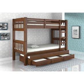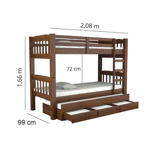 Treliche itália castanho com 3 gavetas - Kamabel  A treliche Italia com 3 gavetas em Madeira Maciça reúne o estilo e a sofisticação que você precisa, o seu ambiente sem dúvida ficará mais lindo e decorado! Produzida em excelente estrutura que oferece mais resistência ao móvel e com perfeito acabamento em Pintura U.V. que proporciona sensação ao toque e garante maior durabilidade. Tenha mais espaço, conforto e praticidade em suas noites de sono!Características GeraisPara Colchão 0.88 x 1.88 Obs: OS COLCHÕES NAO ACOMPANHAM O PRODUTO!!Produto fabricado em 100% Madeira Maciça Pinus.Espessuras dos pês 0.8 x 0.8 cmGrade Lateral maciça reforçada;Possui Estrado Reforçado;Exclusiva Grade de Proteção na parte lateralSuporta no Máximo 150 kg;Possui um Fino Acabamento;Cama Auxiliar com 3 gavetas e rodízios.Ripas e sarrafos do estrado em madeira maciça.colchoes com máximo 14cm de altura para utilizar na cama AuxiliarProduto versátil encaixa em vários ambientes.Lindo design.Pode colocar escada em ambos os ladosMedidas aproximadas:Produto montado: Altura: 166 cm Largura: 208 cm Profundidade: 99 cmGavetões área útil: Altura: 9,5cm x Largura 47,5cm x Profundidade: 47,5cmAltura de cada travessa 83cmAs barras tem 12cm de larguraMedida da cama auxiliar:Altura 43cm x largura 89cm x Comprimento 190cmEspaço do vão entre as camas 72cm