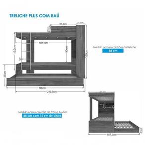 Um ótimo móvel para quem procura otimizar o espaço do quarto das crianças com bom gosto equalidade.Esta treliche com báu da Santos Andirá, além das camas de solteiro, também dispõe de baú nacabeceira, onde pode ser acomodado o travesseiro, cobertor, lençol, brinquedos, etc.As prateleiras na cabeceira acomodam outros pertences como caixas, brinquedos, livros,eletrônicos, e toda a decoração que quiser expor.A cama superior possui proteção lateral para maior segurança de quem dorme na cama de cima epara chegar até lá...escada metálica em alumínio!Cada cama suporta até 80Kg, sem impacto.Recomendamos que as medidas dos colchões para esta Treliche sejam de:- Cama superior: 0,88 cm com no máximo 15 cm de altura- Cama do meio: 0,88 cm com altura à sua necessidade- Cama auxiliar: 0,88 cm com altura máxima de 15 cm, permitindo que ao guardar a cama ela seencaixe perfeitamente.O acabamento na cor madeirada é com verniz fosco, tudo dentro dos padrões de preservação aomeio ambiente.O quarto dos seus filhos ficará muito mais confortável com esse móvel, e é uma ótima opção paraacomodar até três filhos num mesmo quarto.