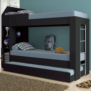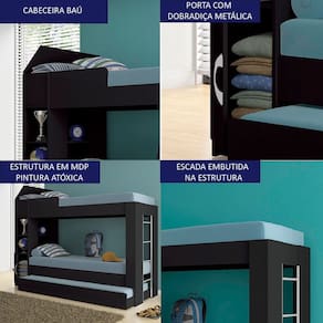 A Treliche Solteiro é a solução prática e elegante para otimizar seu espaço com conforto e estilo. Estrutura robusta em MDP 15mm, oferece durabilidade e resistência. Com 225cm de comprimento x 87cm de largura ideal para quartos compactos, permitindo acomodar visitas sem complicações e para quem busca versatilidade sem abrir mão do conforto. Conta com uma cama auxiliar com rodízios que facilitam a abertura ou fechamento, proporcionando uma cama extra sem ocupar espaço permanente. Além disso, possui 01 porta com dobradiças metálicas, 04 nichos e cabeceira baú, que garantem espaço extra para armazenar roupas de cama, travesseiros e outros itens de sua preferência. Com escada embutida na estrutura do móvel, projetada para dar acesso seguro à cama superior, ocupando pouco espaço. Combina um design moderno com funcionalidade, adicionando um toque de sofisticação à decoração do ambiente. Indicado colchão solteiro 78x188x12cm. Indicamos que o colchão tenha no máximo 12cm de altura para ocorrer o fechamento total da cama auxiliar. Este móvel chegará em sua casa separado em 03 volumes.