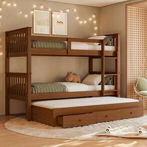 Treliche Woodstore com 3 Camas de Solteiro – Beliche com Cama Auxiliar e Gavetas