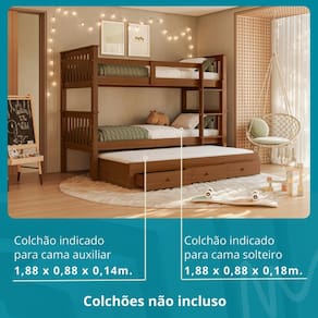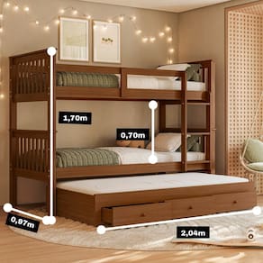 Treliche (beliche com 2 camas de solteiro): 204 cm (C) x 170 cm (A) x 97 cm (L)Cama auxiliar com gavetas: 188 cm (C) x 30 cm (A) x 88 cm (L)Altura entre as camas: 70 cmComprimento total com cama auxiliar aberta: 200 cm