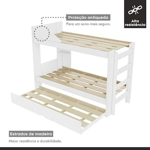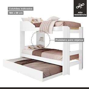 Sim, a treliche é projetada para ser segura e é ideal para quartos infantis ou adolescentes. Produto Montado: Sim Acabamento da Prateleira: Pintura Texturizada UV Acompanha Cama Auxiliar: Sim Acompanha Colchão: Não Altura do Estrado até o Chão: 33 cm Ambiente Principal: Quarto Cama Auxiliar Acompanha Colchão: Não Cama Auxiliar com Rodízio: Sim Cama Auxiliar Suporta Até (kg): 100 kg codigo_ean: 7900288016317 Complexidade da Montagem: Média: pode ser montado por mais de uma pessoa e/ou necessite de maior conhecimento para montagem Cor: Branco Cor do Produto: Branco Escala de Brilho: Fosco Escala de Brilho da Prateleira: Fosco Extensível: Não Itens Inclusos: 1 Treliche Indy e Manual de Montagem Linha ou Coleção: Indy Manual de Montagem e Instalação: https://product-hub-prd.madeiramadeira.com.br/957953/documents/2cb05a32-23e5-44bf-8f88-acd7d5fcaeb9423manualtrelicheindy20192.pdf Marca: Espresso Móveis Material da Escada: MDP Material da Prateleira: MDF Material do Estrado: Pinus e Eucalipto Material Principal: MDP Necessita Montagem: Sim Origem do Produto: Nacional Permite a Utilização de Cama Auxiliar: Sim Peso: 76,79 kg Peso Máximo por Prateleira: 3 kg Possui Baú: Não Possui Escrivaninha: Não Possui Gavetas: Não Possui Pés: Não Possui Portas: Não Possui Prateleiras: Sim Possui Rodízio: Não Quantidade de Prateleiras: 01 Prateleira Recomendações de Uso, Manutenção e Limpeza: Na limpeza não utilizar produtos químicos e abrasivos usar apenas um pano umedecido para garantir a maior durabilidade do móvel. Sistema de Montagem: Parafusos, Porcas e Pregos Tamanho do Colchão Indicado (L x C): 88cmx188cm Tamanho do Colchão Indicado Cama Auxiliar: 88 x 188 (cm) Tipo de Cama: Treliche Tipo de Colchão: Solteiro Tipo de Estrado: Fixo