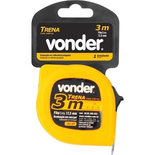 A Trena 3M Vonder mm/pol corpo plástico é prática, leve e resistente. Tem fita em aço com marcação em milímetros e polegadas, pintura brilhante e numeração contínua, que garante leitura rápida e precisa. Possui trava de fita, presilha para cinto e gancho ajustável, ideal para medições internas e externas no dia a dia.