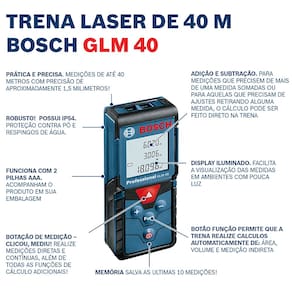 Trena a Laser Cor Vermelha GLM40 Alcance de 40 Metros + Saco Protetor com 2 Pilhas - 0601072900-000 - BOSCH