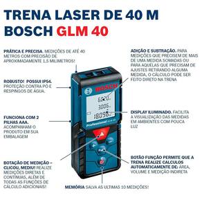 Trena à Laser GLM 40 Medidor de Distância à Laser 40 Metros BOSCH Medições com mais facilidade, agilidade e precisão Diversidade de funções e robustez, com 40 metros de alcance e proteção contra poeira e água Contém memória de 10 medições, além de possuir diversas funções, como medição contínua, cálculo de área, volume, Pitágoras simples, adição e subtração Possui ajuste da unidade de medida em metros, pés e polegadas DADOS TÉCNICOS: Díodo laser: 635nm, < 1mW Amplitude de medição: 0,15 40 m Classe de laser: 2 Precisão de medição, normal: mais ou menos: 1,5 mm Tempo de medição, normal: menor que 0,5 seg. Tempo de medição máx.: 4s Alimentação de energia: 2 x 1,5 V LR03 (AAA) Dispositivo de desconexão automática: 5 min. Unidades de medida: m/cm, pés/polegadas Número dos valores da memória: 10 Vida útil da bateria, medições individuais aprox.: 5.000 Proteção contra pó e salpicos de água: IP 54 Proteção conta pó e respingos dágua IP 54 Alcance: 0,15 40,00 metros Entrada para tripé: 1/4 e 5/8 POL APLICAÇÕES: Medição de distâncias e alturas com um clique, medição contínua conforme o medidor é movimentado, medição de área e volume, medição de altura indireta. Medição de distâncias: você só precisa apontar o laser para o local que deseja medir e pressionar o botão Medição contínua: veja o resultado aparecendo na tela em tempo real conforme move o medidor Medição de área: meça a largura e o comprimento e o medidor calcula na hora quantos metros quadrados tem o local. Medição de volume: meça a largura, o comprimento, a altura e o medidor calcula na hora quantos metros cúbicos tem o ambiente. Medição de altura indireta: calcule facilmente a altura até mesmo de locais que não têm um teto como anteparo. PÚBLICO ALVO: Orçamentistas (exemplos marceneiros, pintores, pedreiros, etc.), instaladores em geral, engenheiros, arquitetos, profissionais de construção em geral. CERTIFICADO: ISO 9001 DIFERENCIAL TÉCNICO: Trena laser para medições de até 40 metros que faz as contas para Você: calcule áreas, volumes e até alturas direto no aparelho. ACOMPANHA: 1 Trena Laser de 40 m Bosch GLM 40, 1 Manual de instruções, 1 Certificado do fabricante, 2 pilhas AAA, 1 Bolsa de proteção Modelo: GLM 40 Código de Fábrica: 0601072900-000 Marca: BOSCH Garantia: 12 MESES Embalagem: Caixa de papelão