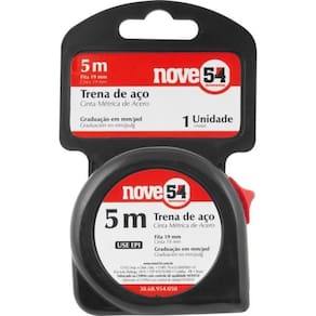 Trena Aço 5Mx19Mm Nove54 Ref. Fornecedor: 3868954050Marca: Nove54 Conteúdo da embalagem: 1 Trena Destaques e diferenciais: Fita em aço com pintura brilhante, graduação em milímetros e polegadas, além de numeração contínua, facilitando a leitura e proporcionando maior precisão. Possui botão trava da fita que facilita a leitura e presilha para cinto, auxiliando no transporte e segurança durante o uso. Conta ainda com gancho ajustável na ponta da fita, permitindo medições internas e externas mais precisas.