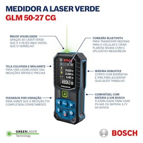 A trena laser GLM 50-27 CG Professional oferece visibilidade superior do ponto laser, design muito duradouro e documentação rápida. Sendo seu ponto de laser verde mais visível se comparado ao laser vermelho, ele é especialmente qualificado para medições de longa distância em condições internas com luminosidade. Graças à combinação do design com certificação de proteção IP65 e um revestimento de borracha para absorção de choque, a ferramenta resiste a quedas de 1,5 metros, mesmo em concreto duro e canteiros de obras adversos. A conectividade Bluetooth® e o aplicativo Bosch MeasureOn garantem uma documentação e transferência rápida dos resultados de medição em um abrir e fechar de olhos.